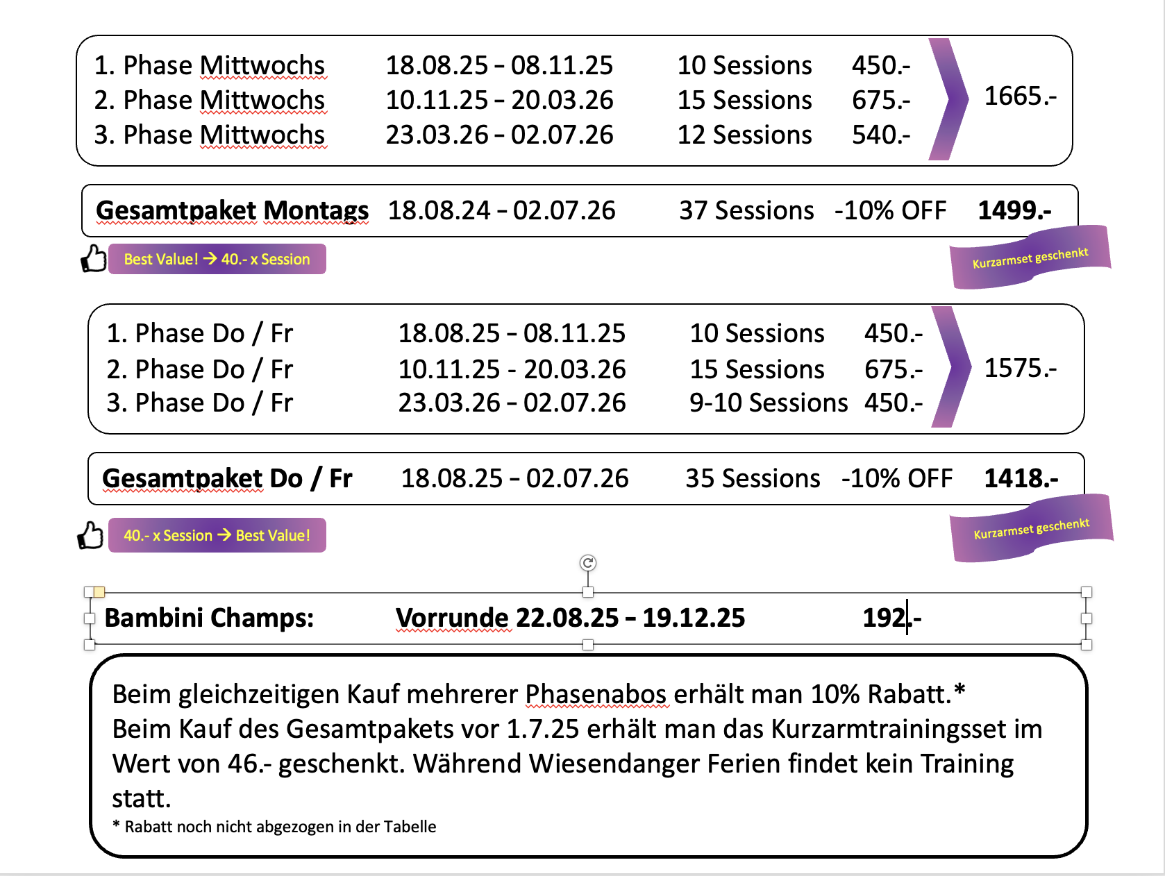 Die Trainings der Phasenabos und Bambini Champs finden nur während der Schulzeit statt. Während den Schulferien finden spezielle Events statt, die man einzeln buchen kann.